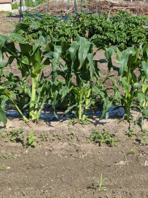 里芋の畝の草取りをしていると、風にトウモロコシの葉が「カサ!! カサ! カサ!」と歌う。