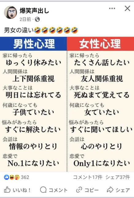 - 女は話して、話を聞く、男は話すが話を聞かない。