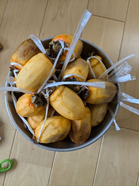 干し始めて10~15日ほど経つ頃(11月20日から25日)から実の繊維を解すように、手に清潔なビニール袋等に包んで、毎日揉むと柔らかくなり甘さも均一になるのだ。