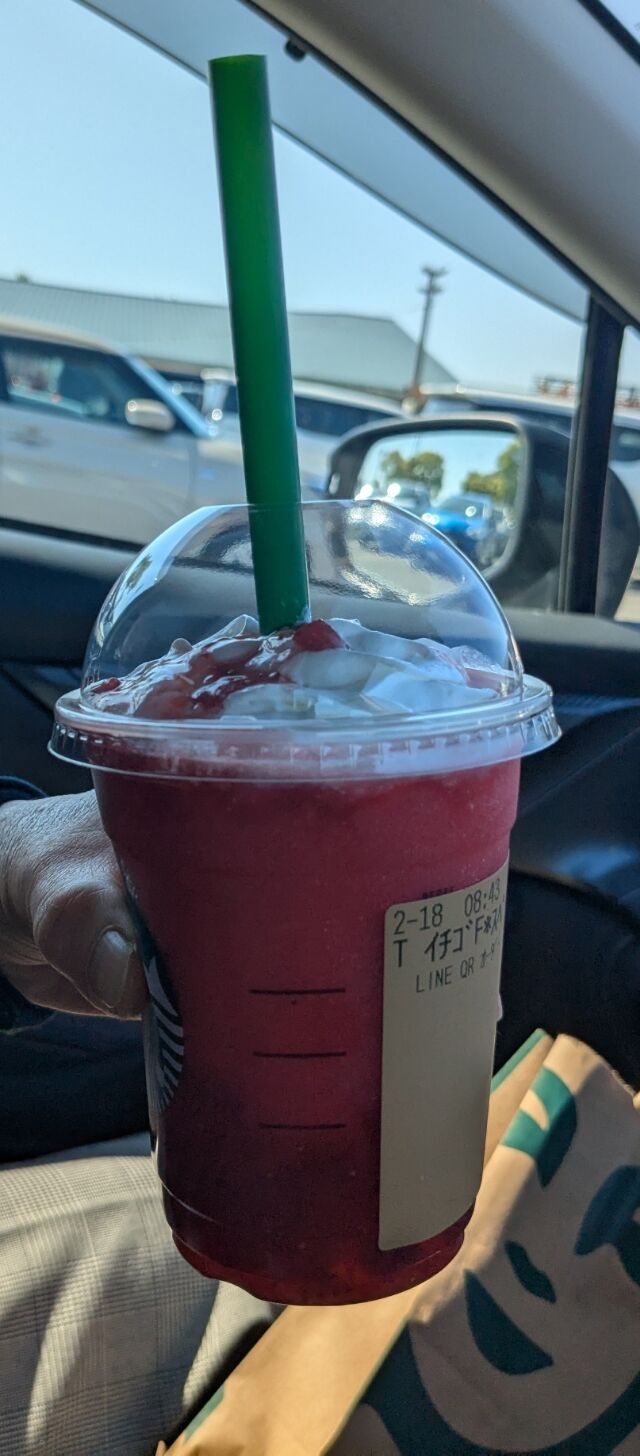 暖かい『アーモンドミルクラテ』をオーダーしていた妻は、親父の赤い苺のフラペチーノに魅せられて、「ちょっと頂戴!」と言う。