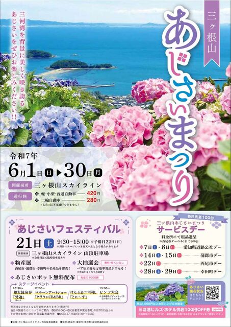 今朝9:30に開幕した三ヶ根山スカイライン山頂駐車場で開催された『あじさいフェスティバル』へ妻と行った。スカイラインを自動車で通行すると通行料420円が徴収される。