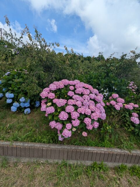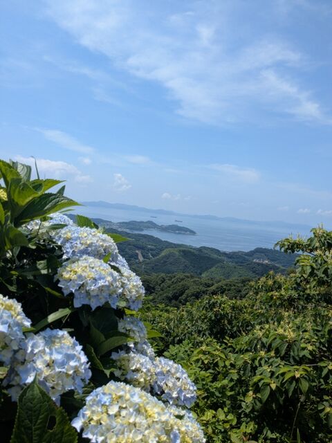 晴れた青い空と三河湾を背景に、紫陽花が栄えている。