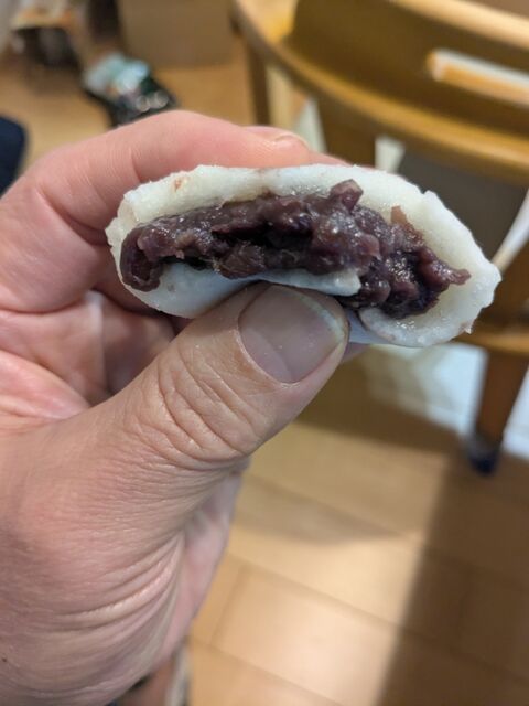 餅の中にたっぷりと粒餡が詰まっている。餡は程よく甘く餅も柔らかく美味い。